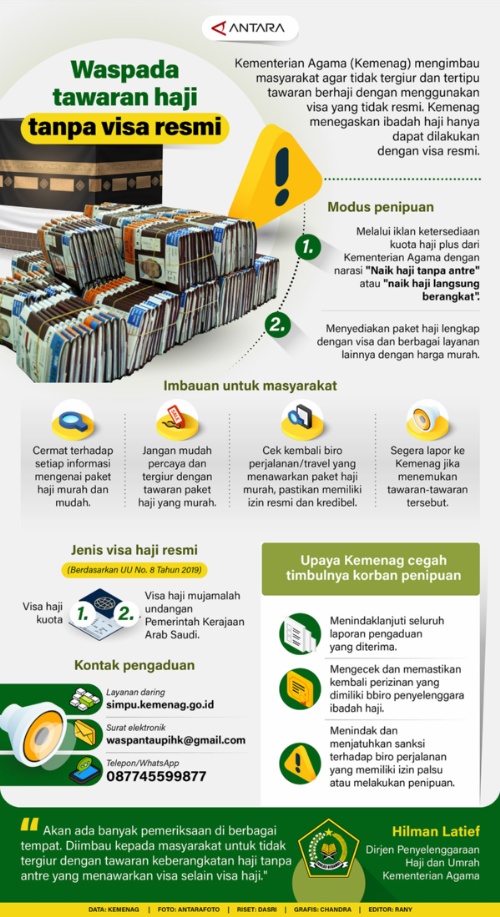 MINANGKABAUNEWS.com, INFOGRAFIS — Kementerian Agama (Kemenag) mengimbau masyarakat agar tidak tergiur dan tertipu tawaran berhaji dengan menggunakan visa yang tidak resmi. Kemenag menegaskan ibadah haji hanya dapat dilakukan dengan visa resmi.(antaranews.com)