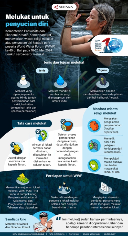 MINANGKABAUNEWS.com, INFOGRAFIS — Kementerian Pariwisata dan Ekonomi Kreatif (Kemenparekraf) menawarkan wisata religi melukat atau penyucian diri kepada para peserta World Water Forum (WWF) ke-10 di Bali pada 18-25 Mei 2024. Berikut serba-serbi melukat. (antaranews.com)