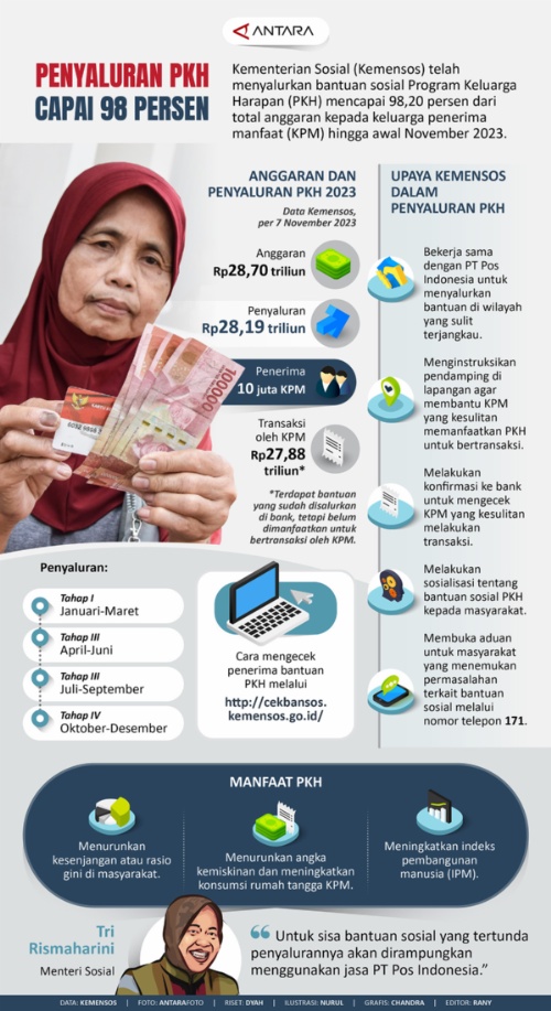 MINANGKABAUNEWS.com, INFOGRAFIS — Kementerian Sosial (Kemensos) telah menyalurkan bantuan sosial Program Keluarga Harapan (PKH) mencapai 98,20 persen dari total anggaran kepada keluarga penerima manfaat (KPM) hingga awal November 2023. (antaranews.com)