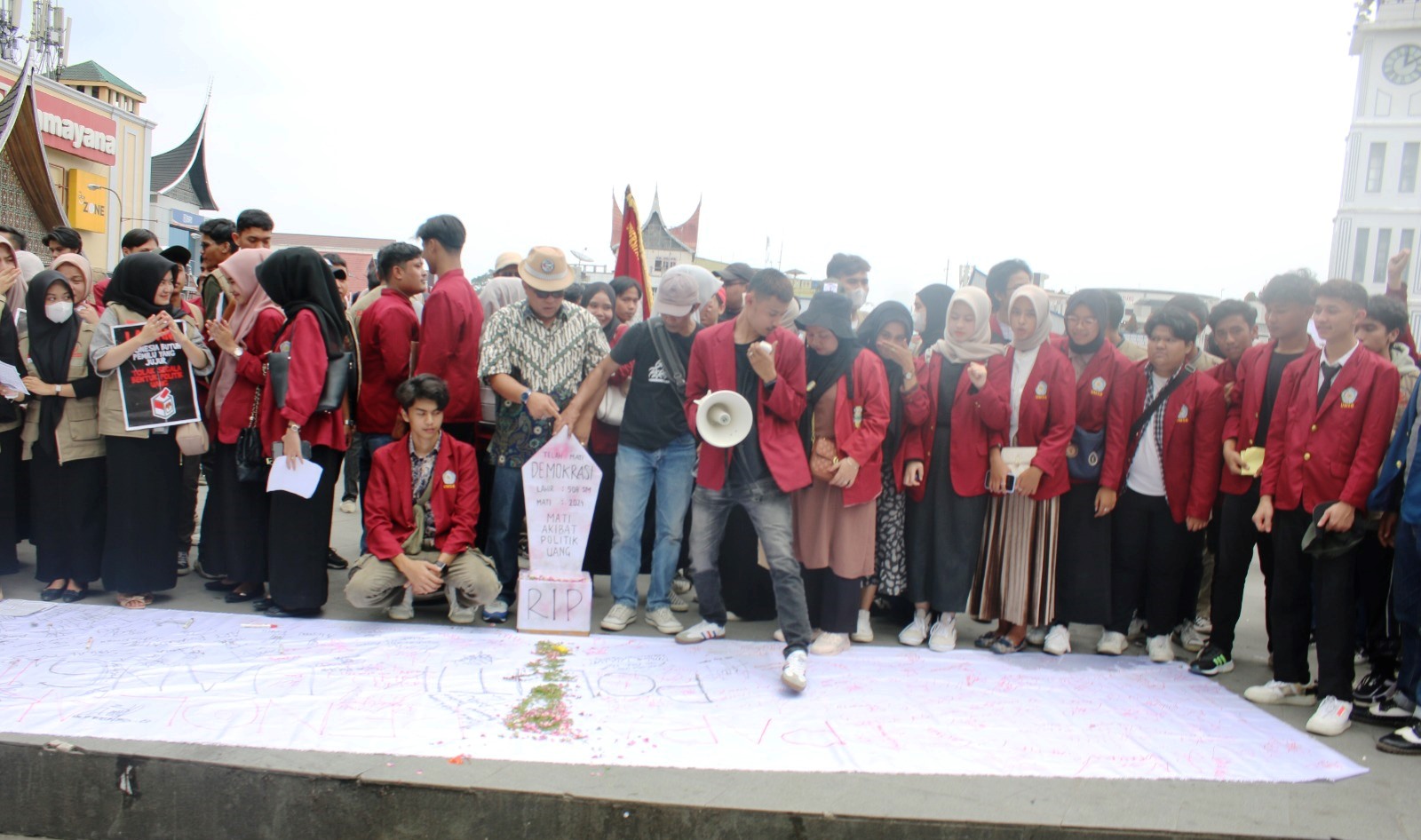 Usai aksi jalan kaki yang dikuti ratusan mahasiswa berbaju almamater merah, rombongan mahasiswa sempat melakukan aksi teatrikal hingga orasi, sambil memajang sejumlah spanduk berisi imbauan bahaya politik uang.