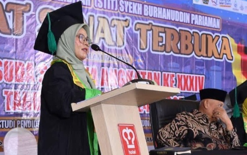 Neni Triana menyampaikan selamat atas capaian mahasiswa. “Teruslah mengejar cita-cita di masa depan, tapi jangan lupakan bahwa kita adalah alumni perguruan tinggi agama Islam yang membawa nama besar Syekh Burhanuddin. Spirit dan identitas sebagai orang berpendidikan agama harus dipegang dan dilaksanakan dimana pun nanti berada. Dengan predikat sarjana yang melekat pada diri mahasiswa, tentu ada tanggung jawab keagamaan dan sosial yang dipikul. Secara sederhana, suatu tanggung jawab sosial merupakan sebuah komitmen untuk merespons permasalahan sosial, atas dasar kepedulian sosial. Tentu saja, setiap makhluk sosial memiliki tanggung jawab sosial. Tetapi seorang sarjana memiliki tanggung jawab sosial yang lebih besar dikarenakan pengetahuan yang dimilikinya. Kekuatan ini akan menjadi bernilai tinggi bila digunakan untuk kepentingan kemanusiaan dan kemaslahatan masyarakat,” ujar dia.