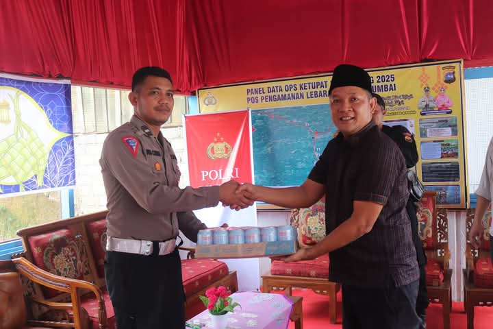 Dalam kunjungan, Jemi Hendra yang didampingi Kabag Umum dan Keuangan Sekretariat DPRD Kabupaten Dharmasraya Yusrizal sekaligus meyerahkan bingkisan kepada tim pengaman yang telah ditugaskan di pos pengamanan lebaran tersebut.