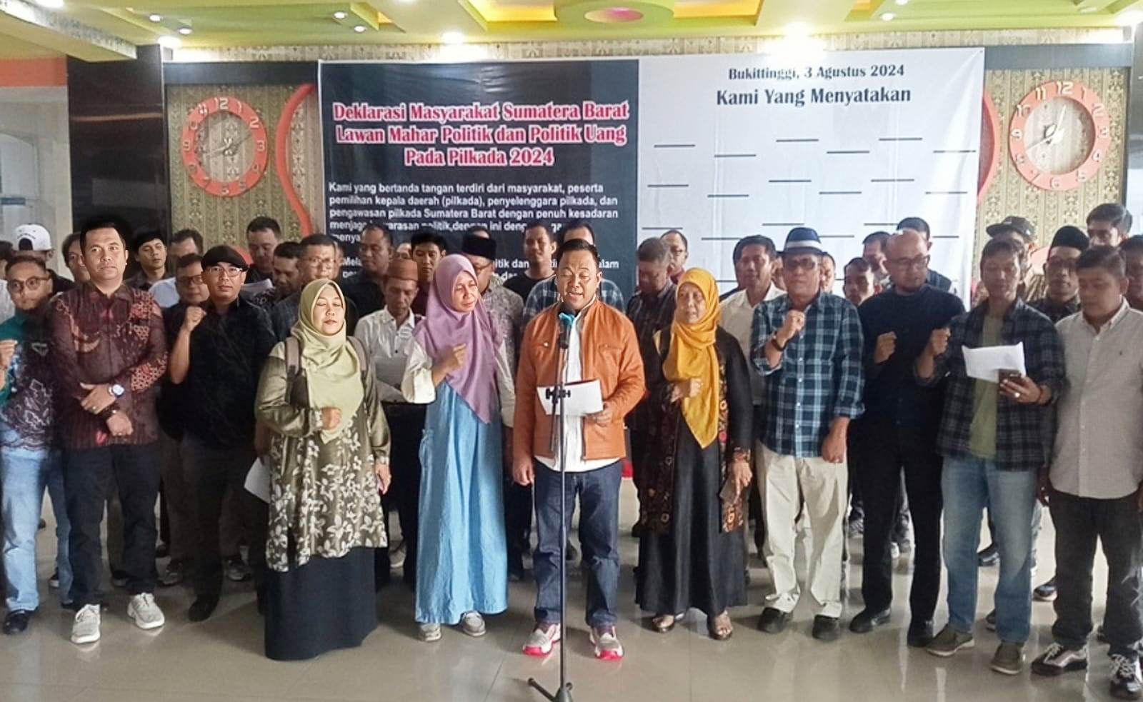 MINANGKABAUNEWS.COM, BUKITTINGGI – Koalisi Masyarakat Sipil Sumatera Barat sepakat bersama-sama mengikrarkan serta mendeklarasikan untuk melawan mahar politik dan politik uang dalam kontestasi pemilihan kepala daerah (Pilkada) serentak tahun 2024 mendatang.