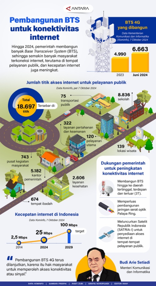 MINANGKABAUNEWS.com, INFOGRAFIS — Hingga 2024, pemerintah membangun banyak Base Transceiver System (BTS), sehingga semakin banyak masyarakat terkoneksi internet, terutama di tempat pelayanan publik, dan kecepatan internet juga meningkat. (ANTARA)