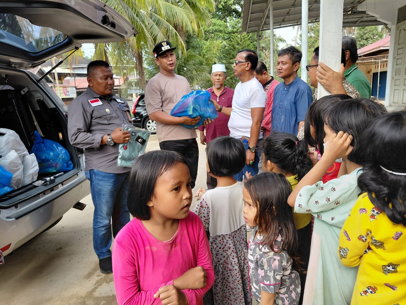 Bantuan diserahkan Alwis Ilyas kepada Kepala Desa Punggung Ladiang Aulia Mardhi Arif disaksikan warga komunitas Lapau Os dan warga Dusun Sampan, Punggung Ladiang. Adnal Yeka, A.Pi, M.Si juga turut langsung memasangkan baju kepada salah seorang anak hadir saat penyerahan bantuan.