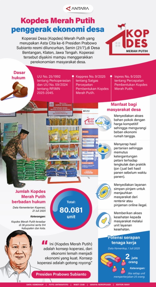 MINANGKABAUNEWS.com, INFOGRAFIS — Koperasi Desa (Kopdes) Merah Putih yang merupakan Asta Cita ke-6 Presiden Prabowo Subianto resmi diluncurkan, Senin (21/7), di Desa Bentangan, Klaten, Jawa Tengah. Koperasi tersebut diyakini mampu menggerakkan perekonomian masyarakat desa. (ANTARA)