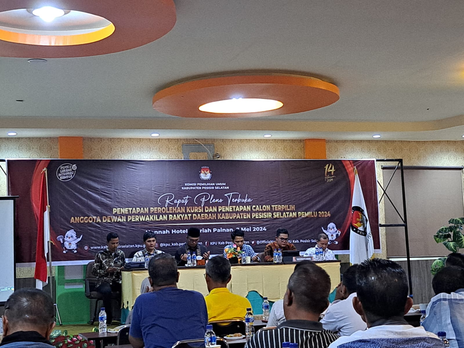 PAINAN — Komisi Pemilihan Umun Kabupaten Pesisir Selatan, Sunatera Barat adakan rapat pleno hasil Pileg 2024 tersebut untuk menetapkan perolehan kursi partai politik dan calon terpilih anggota DPRD Kabupaten Pesisir Selatan 2024-2029.