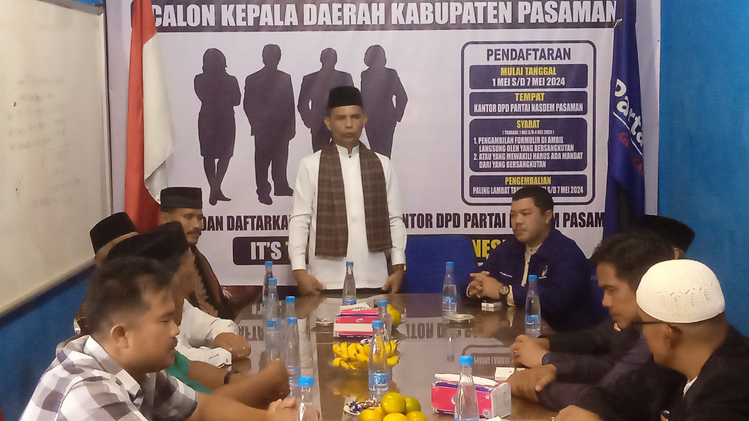 Pasaman, Minangkabaunews.com – Ketua DPD Partai Nasdem Kabupaten Ahmad Khadafi, ST, mengembalikan formulir calon bupati Pasaman ke kantor DPD Partai Nasdem, Minggu (5/05/2024).