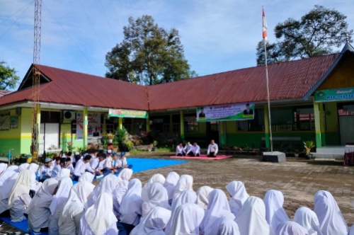 Terlihat siswa dan siswi yang berbaris mengenakan pakaian seragam menengah pertama itu mengikuti upacara bendera dengan penuh hikmat.