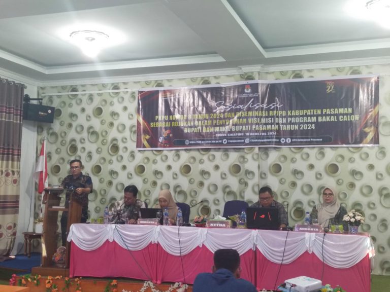 Pasaman, Minangkabaunews.com -Komisi Pemilihan Umum (KPU) Kabupaten Pasaman menggelar sosialisasi Peraturan Komisi Pemilihan Umum Nomor 8 tahun 2024 dan Diseminasi RPJPD Kabupaten Pasaman sebagai rujukan dalam penyusunan Visi, Misi dan program bakal calon Bupati dan Wakil Bupati Pasaman Tahun 2024.