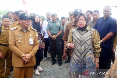 Batola, Kalsel – Menteri Sosial Tri Rismaharini didampingi Pejabat Bupati Barito Kuala, Provinsi Kalimantan Selatan (Kalsel) Mujiyat meninjau lokasi salah satu penerima manfaat program Rumah Sejahtera Terpadu (RST) dengan menggunakan sepeda motor di Desa Sungai Pitung Kecamatan Alalak, Selasa.