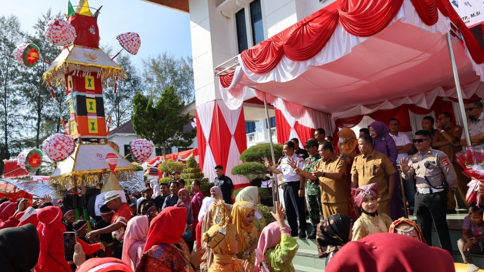 Wali Kota Pariaman, Yota Balad yang didampingi Wakil Wali Kota Pariaman, Mulyadi saat membuka pawai mengucapkan terima kasih kepada seluruh peserta pawai yang bersemangat mengikuti pawai alegoris Tahun 2025.