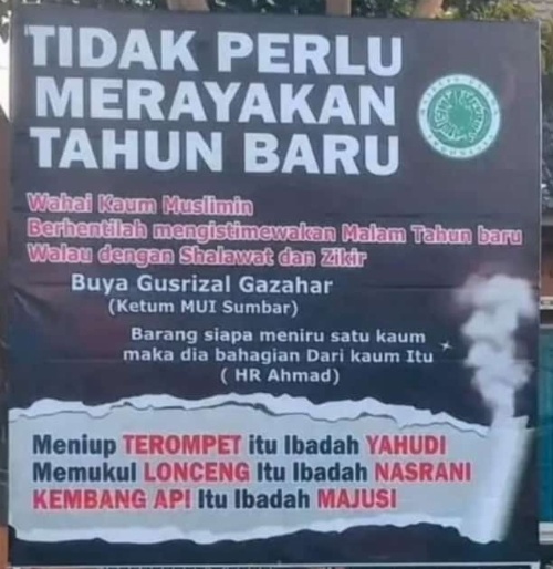 Spanduk tersebut juga menggarisbawahi simbol-simbol perayaan tahun baru yang dinilai berasal dari tradisi agama lain, seperti meniup terompet yang disebut terkait dengan tradisi Yahudi, memukul lonceng yang diasosiasikan dengan Nasrani, serta kembang api yang dianggap bagian dari budaya Majusi. Buya Gusrizal menegaskan bahwa umat Islam perlu memanfaatkan momen tersebut untuk kegiatan yang lebih bernilai dan tidak bertentangan dengan ajaran Islam.