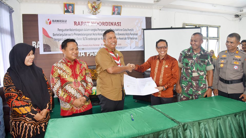 MINANGKBAUNEWS.COM,Pariaman — Ketua Kwartir Cabang (Kakwarcab) 16 Pramuka Kota Pariaman sekaligus Wakil Wali Kota Pariaman Mulyadi, teken Nota Kesepahaman bersama Bawaslu Kota Pariaman pada kegiatan Rapat Koordinasi Penguatan Kelembagaan Dalam Rangka Pengawasan Pemutakhiran Data Pemilih Berkelanjutan yang digelar oleh Badan Pengawas Pemilu (Bawaslu) Kota Pariaman, bertempat di Kantor Bawaslu Kota Pariaman, Kelurahan Kampung Perak, Kecamatan Pariaman Tengah, Selasa siang (23/9/2025).