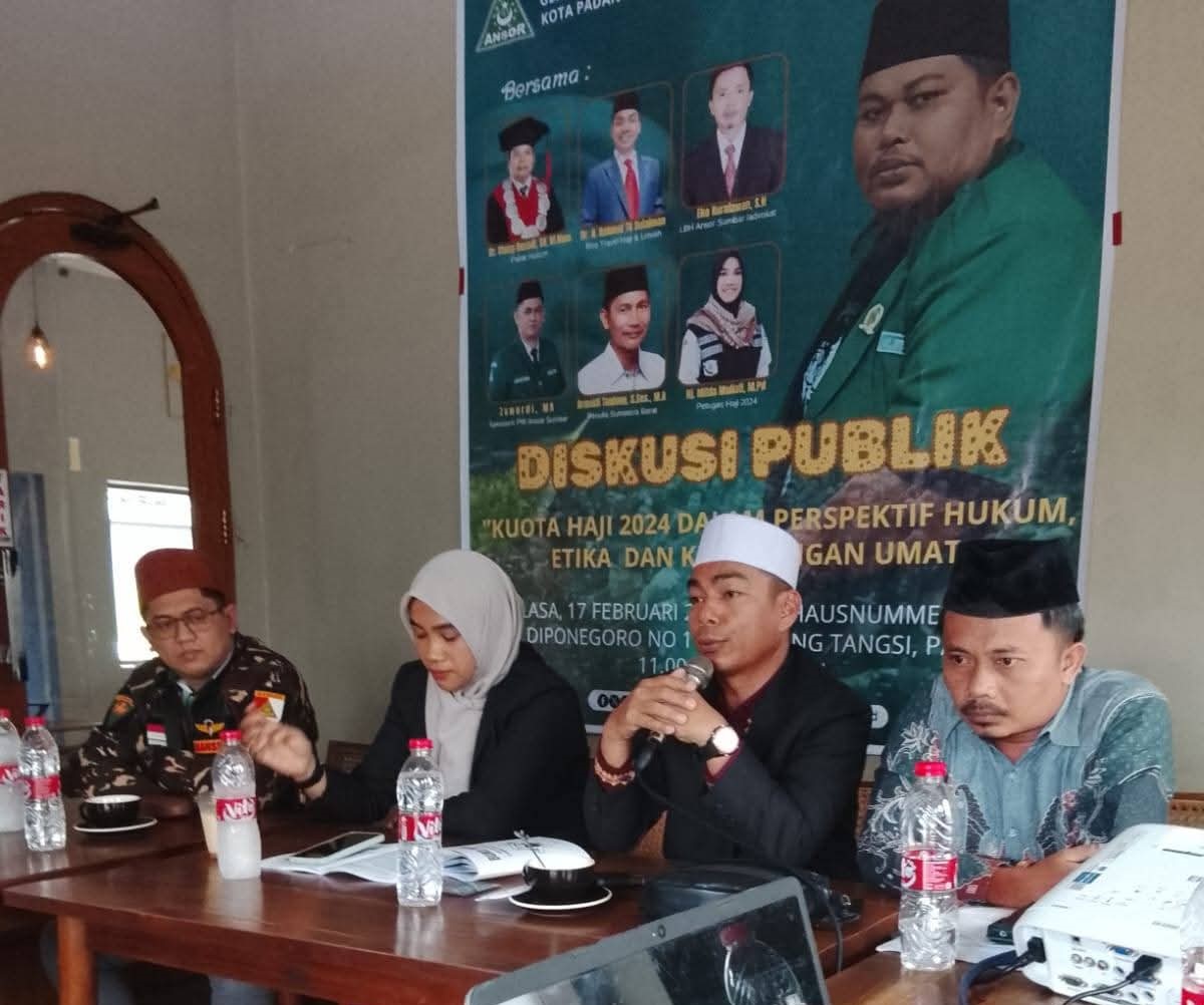 Minangkabaunews.com, Padang – Diskusi terkait haji tidak akan pernah habisnya, mulai dari sebelum keberangkatan, hari H sampai kepulangan ke tanah air jadi hal menarik didiskusikan secara komprehensif. Hal ini jadi poin penting dari diskusi publik dengan tema “Kuota Haji 2024 Dalam Perspektif Hukum Etika dan Kepentingan Umat” yang diselenggarakan Pimpinan Cabang Gerakan Pemuda Ansor Kota Padang, Lembaga Bantuan Hukum (LBH) GP Ansor PW Sumatera Barat dan pihak terkait pada Selasa (17/2/2026) di salah satu cafe di Kota Padang. Peserta perwakilan dari PW GP Ansor Sumatera Barat, PC GP Ansor Solok, PC GP Ansor Bukittinggi, PC GP Ansor Pesisir Selatan dan sebagainya.