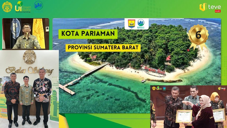 Pada Anugerah UI Green City Metric Rankings Tahun 2024 ini, Kota Pariaman menempati peringkat Keenam Kota Paling berkelanjutan di Indonesia, dan merupakan penghargaan untuk yang ketiga kalinya secara berturut-turut sejak diterima di tahun 2022 yang lalu.