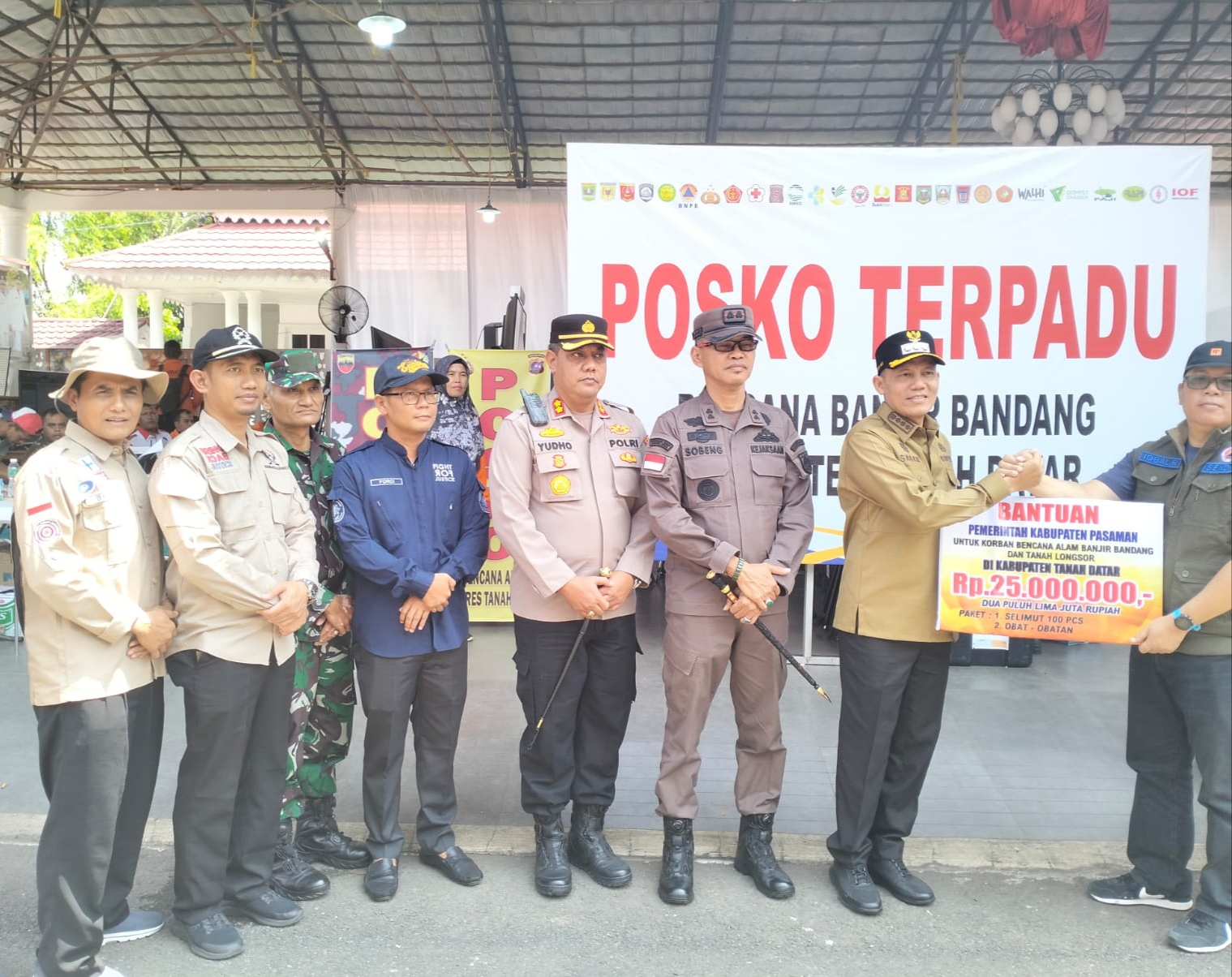 Bantuan untuk Kabupaten Agam diserahkan Bupati Sabar AS di Posko tanggap darurat Bukit Batabuah, Baso, yang diterima Kalaksa BPBD agam Bambang Wasito,