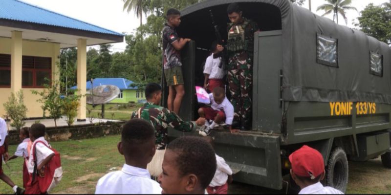 Biasanya anak anak sekolah dari kampung Buohsa berjalan kaki ratusan meter untuk menuntut ilmu. Namun sekarang personil pos Buohsa memberikan keringanan mengantarkan adik asuh bersekolah dengan menaiki kendaraan yang dimiliki personil Satgas Pamtas Kewilayahan Yonif 133/YS.