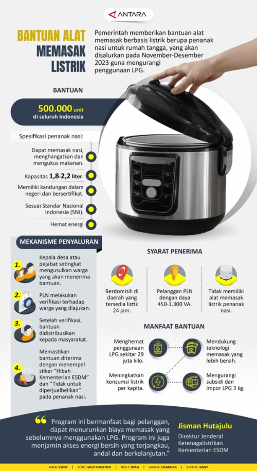 MINANGKABAUNEWS.com, INFOGRAFIS — Pemerintah memberikan bantuan alat memasak berbasis listrik berupa penanak nasi (rice cooker) untuk rumah tangga, yang akan disalurkan pada November-Desember 2023 guna mengurangi penggunaan LPG. (antaranews.com)