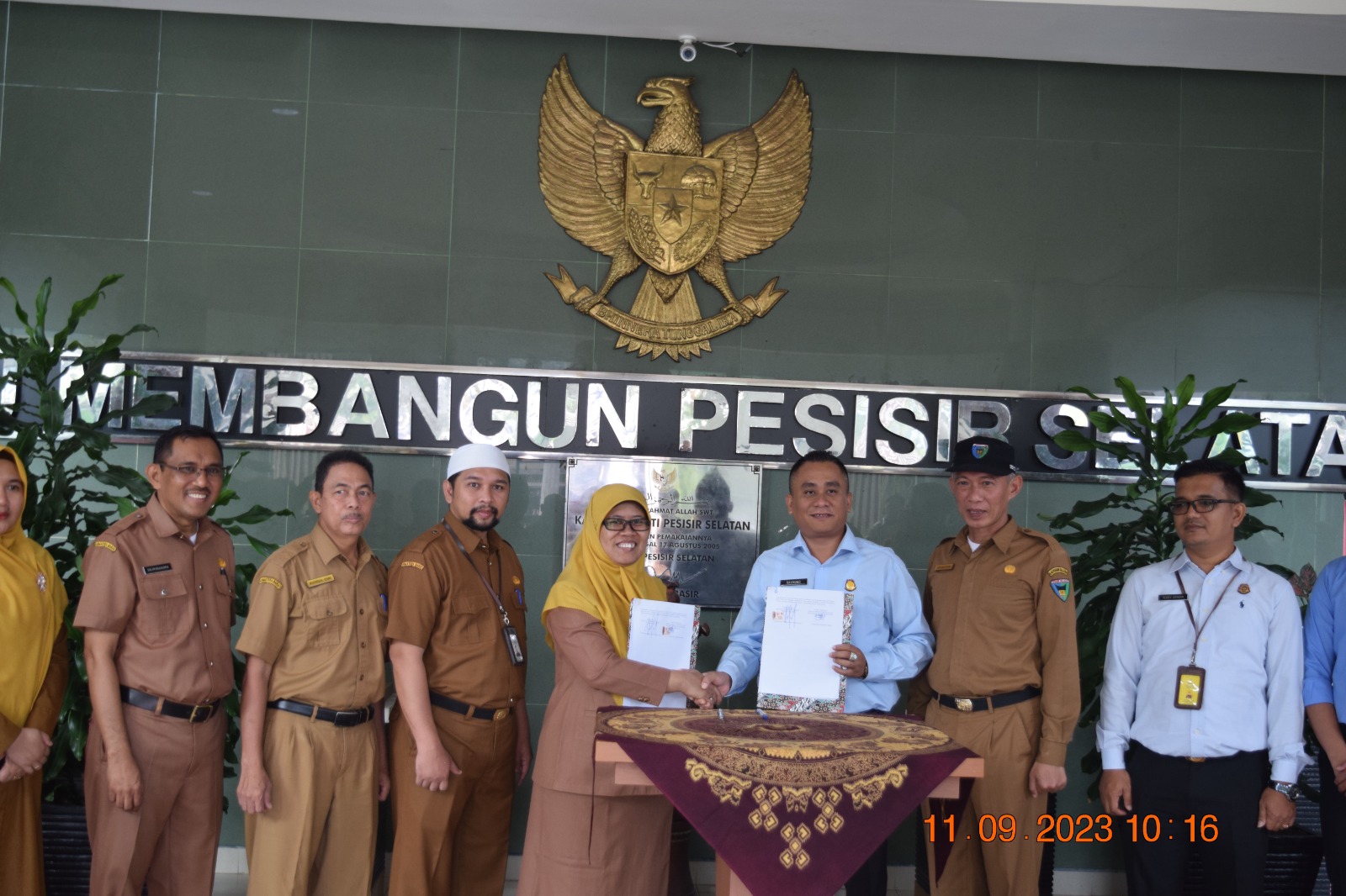 PESSEL — Badan Pengelolaan Keuangan Pendapatan dan Aset Daerah (BPKPAD) Pesisir Selatan dan Kejaksaan Negeri Pesisir Selatan melakukan penandatanganan Perjanjian Kerja Sama (PKS) Pengawasan dan Optimalisasi Pajak Daerah Kabupaten Pesisir Selatan di lobby Kantor Bupati Pesisir Selatan, Senin (11/9).