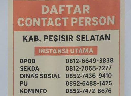 Pesisir Selatan – Pemerintah Kabupaten Pesisir Selatan merilis daftar contact person resmi dari berbagai instansi yang terlibat dalam percepatan penanganan bencana Kabupaten Pesisir Selatan. Daftar ini disampaikan untuk memudahkan masyarakat mendapatkan layanan cepat, tepat, dan terkoordinasi selama masa tanggap darurat.