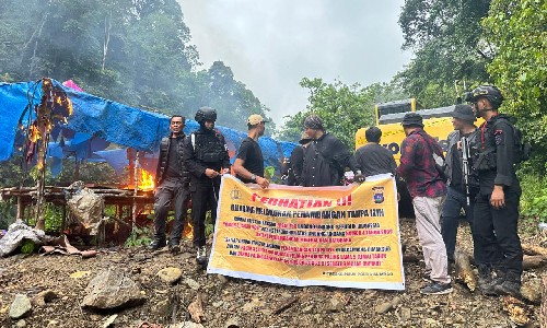 Selain itu, tim juga memasang police line dan spanduk larangan sebagai penegasan bahwa kawasan tersebut tidak boleh lagi digunakan untuk aktivitas penambangan ilegal.