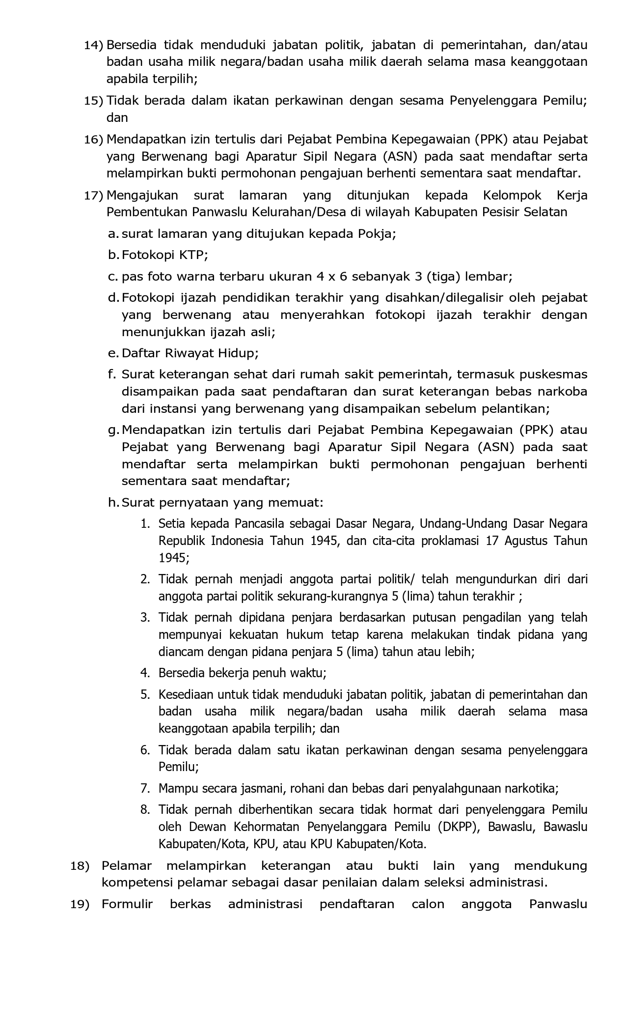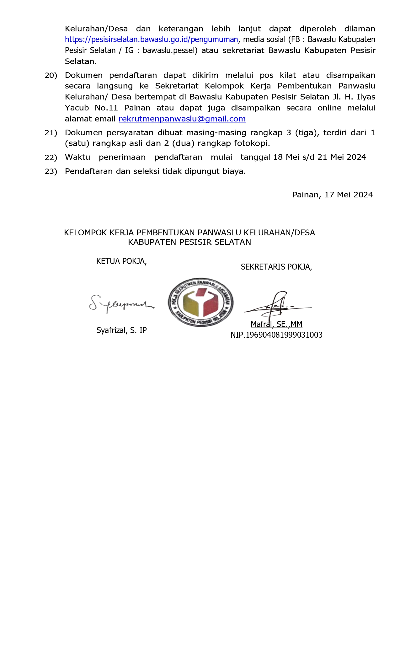 PENGUMUMAN PENDAFTARAN CALON ANGGOTA PANWASLU KELURAHAN/DESA DALAM RANGKA PEMILIHAN SERENTAK TAHUN 2024 Redaksi17/05/202417/05/2024 Related postsBantuan 6 Ton dari Forum Komunikasi Perantau Pesisir Selatan (FKP Pessel) Tualang untuk Korban Bencana Alam di SumbarProyek Irigasi Mangkrak Jelang Akhir Tahun, Anggota DPR RI Rahmat Saleh Geram: “Petani yang Paling Menderita!Wardi (Cit) Nomor Urut 1, Putra Petani yang Siap Membawa Perubahan Nyata untuk Nagari Ampang TulakDi Pesisir Selatan, PMII Padang Antarkan 100 Paket Sembako ke Pancung Taba dan Limau GadangBupati Pesisir Selatan Serukan Kewaspadaan Cuaca Ekstrem dan Ajak Masyarakat Gelar Doa BersamaPeringati Hakordia 2025, Kejari Pesisir Selatan Adakan Kuliah Umum di STAI YPI AI Ikhlas Painan