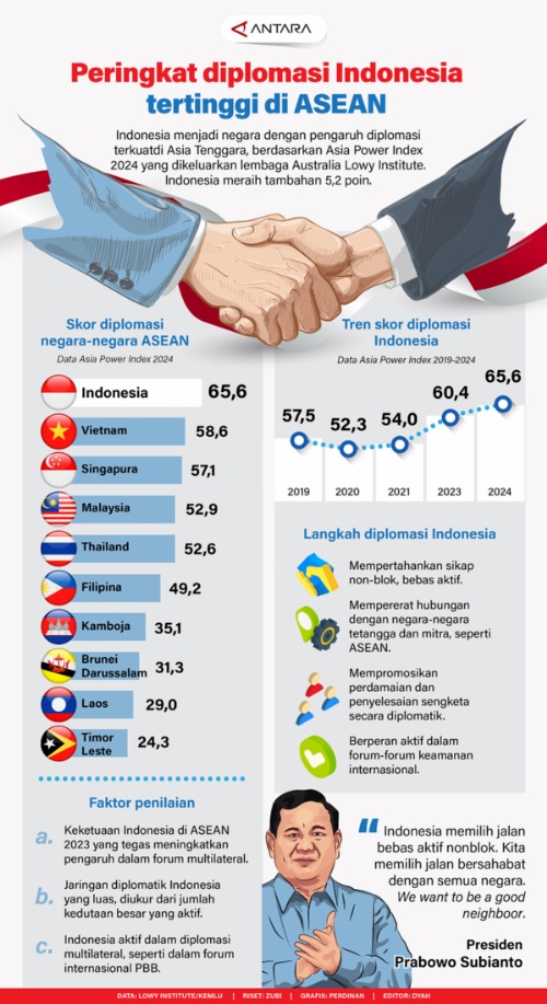 MINANGKABAUNEWS.com, INFOGRAFIS — Indonesia menjadi negara dengan pengaruh diplomasi terkuat di Asia Tenggara, berdasarkan Asia Power Index 2024 yang dikeluarkan lembaga Australia Lowy Institute, Kamis (3/10). Indonesia meraih tambahan 5,2 poin dibandingkan tahun sebelumnya. (ANTARA)