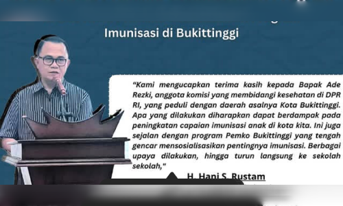 Pjs.Wali Kota Bukittinggi, H.Hani Syopiar Rustam, mengapresiasi dan mendukung penuh kegiatan sosialisasi imunisasi, yang diinisiasi Ade Rezki Pratama selaku Anggota DPR RI, dari daerah pemilihan (dapil) II Sumbar. Hal tersebut sejalan dengan apa yang tengah dilakukan Pemko Bukittinggi, untuk meningkatkan capaian imunisasi dasar lengkap anak.