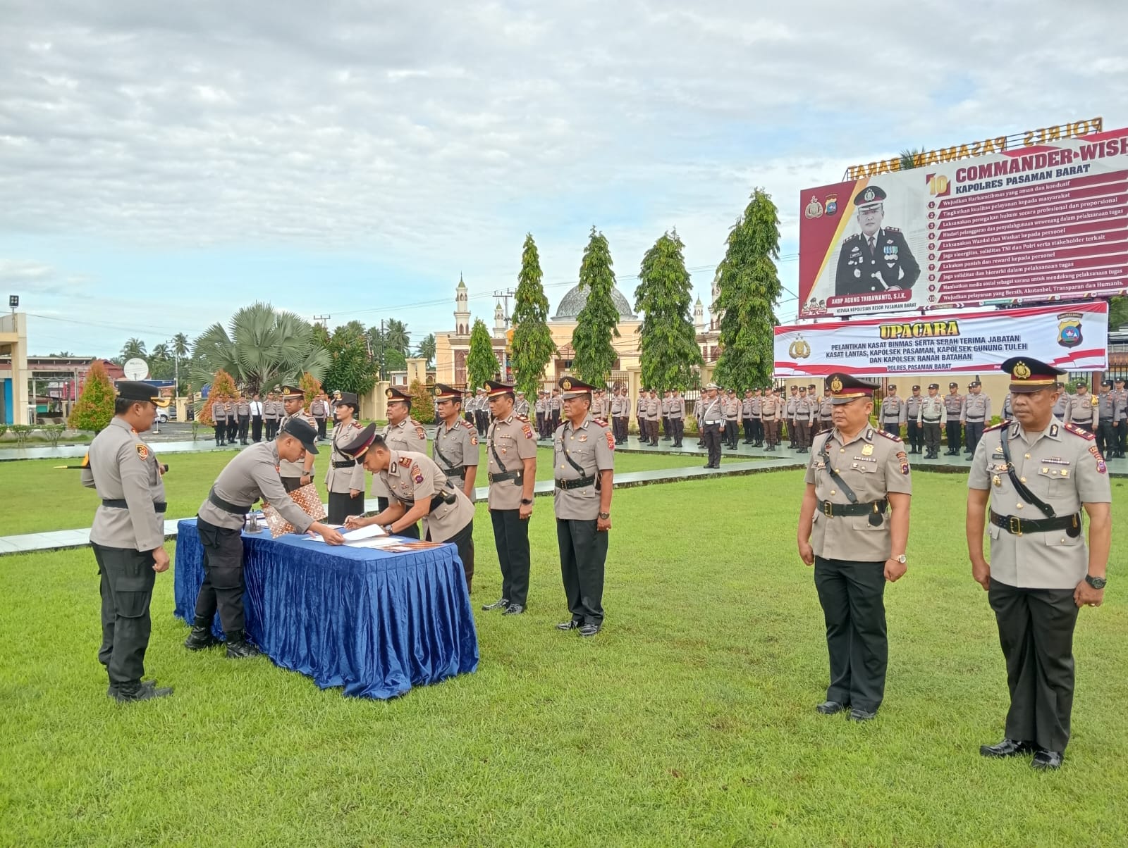 PASAMAN BARAT – Kepolisian Resor Pasaman Barat, Polda Sumatera Barat (Sumbar) menggelar upacara Pelantikan dan Serah Terima Jabatan (Sertijab) sejumlah Pejabat Utama (PJU) dan Kapolsek jajaran Polres Pasaman Barat, yang dilaksanakan di halaman Mako Polres setempat, Senin (14/10/2024) pagi.