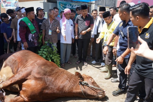 Penyerahan dilakukan secara simbolis oleh Wakil Gubernur Sumatera Barat, Vasko Ruseimy Sutan Nagari Sati, yang juga turut serta dalam prosesi pemotongan sapi kurban berbobot hampir satu ton tersebut.