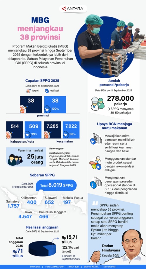 MINANGKABAUNEWS.com, INFOGRAFIS — Program Makan Bergizi Gratis (MBG) menjangkau 38 provinsi hingga September 2025 dengan terbentuknya lebih dari delapan ribu Satuan Pelayanan Pemenuhan Gizi (SPPG) di seluruh provinsi di Indonesia. (ANTARA)