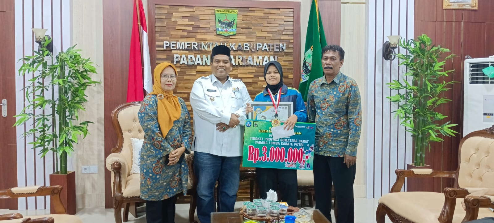 MINANGKABAUNEWS.COM,Parit Malintang,- Bupati Padang Pariaman Suhatri Bur berikan bonus kepada Alya Nayla, Atlet Karate Padang Pariaman yang berhasil meraih medali emas cabang olahraga karate putri pada ajang O2SN Tingkat Provinsi Sumatera Barat yang dilaksanakan bulan Agustus 2023 lalu.