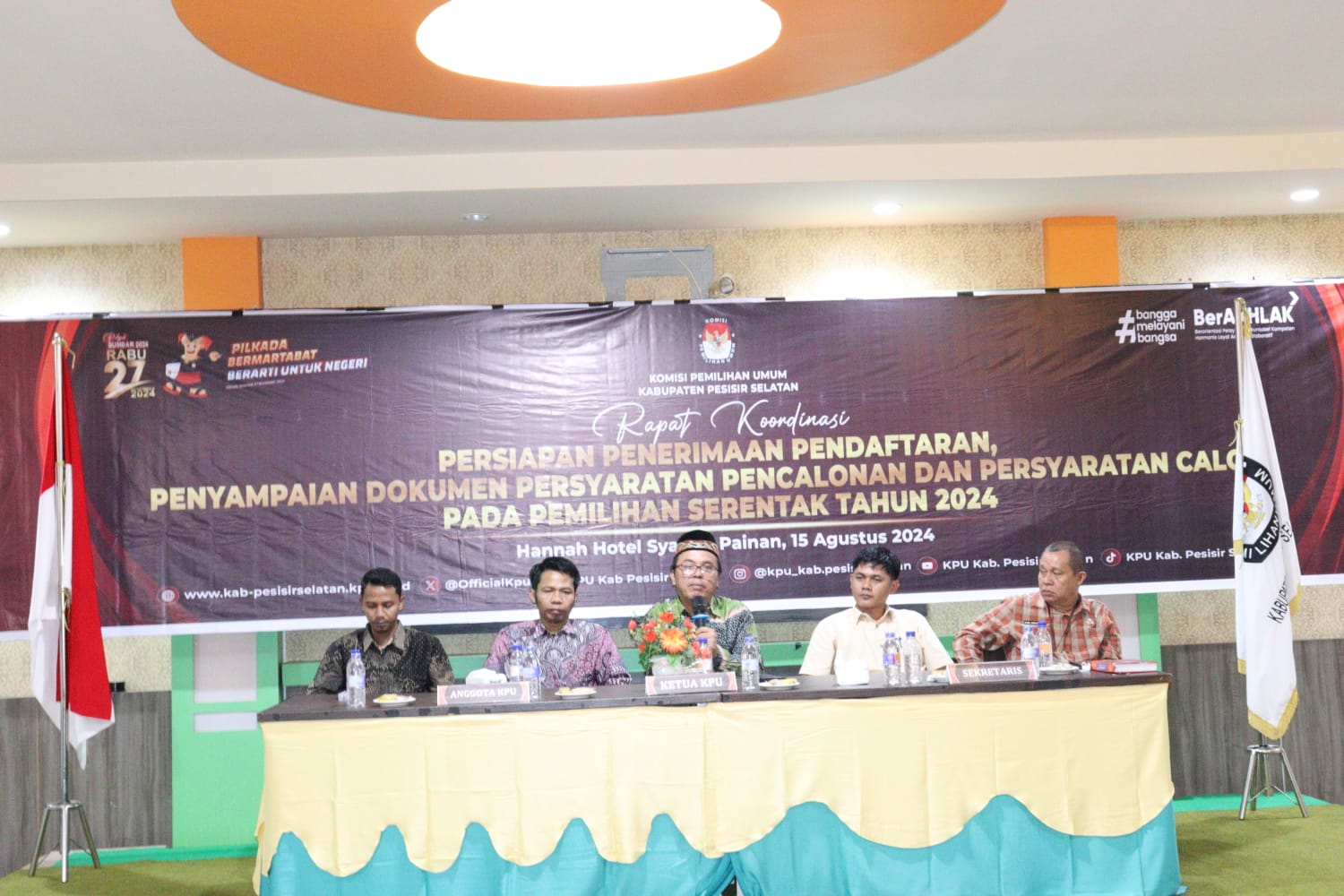 PAINAN— Komisi Pemilihan Umum (KPU) Kabupaten Pesisir Selatan menggelar Rapat Koordinasi Persiapan Penerimaan Penyampaian Dokumen Persyaratan Pencalonan dan Persyaratan Calon Pada Pemilihan Serentak Tahun 2024 bertempat Hotel Hannah Painan (15/8/2024).