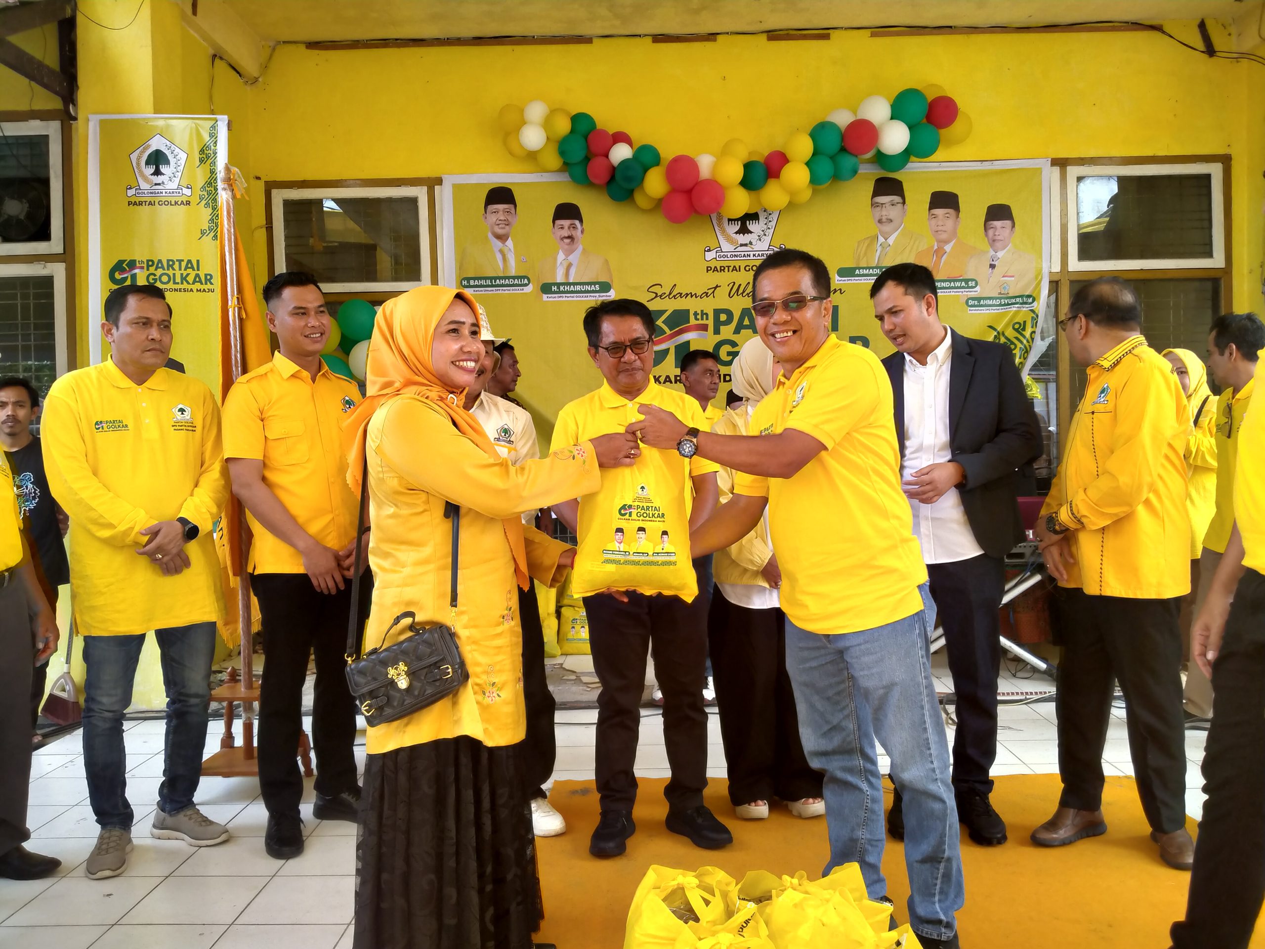 Fungsionaris Partai Golkar, John Kenedy Azis yang sedang Bupati Padang Pariaman menyerahkan paket sembako. “61 tahun, Golkar terasa sangat matang,” katanya.