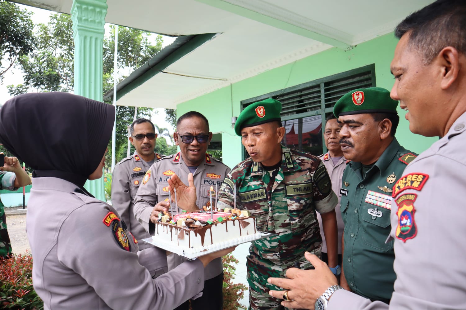 Sambil tersenyum dan gembira, Danramil pun meniup api lilin kue ulang tahun yang dibawa rombongan personil Polres Agam itu.