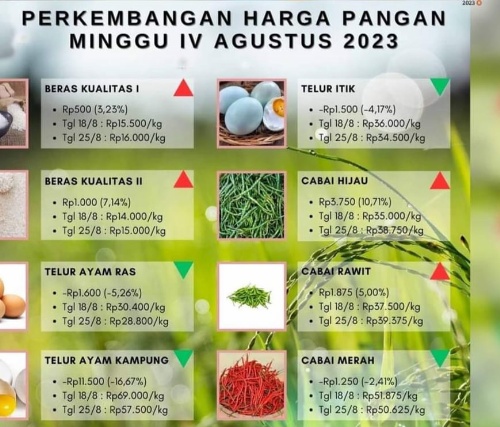 “Adapun yang mengalami kenaikan harga selain beras kualitas I dan ll adalah cabai hijau dan cabai rawit. Cabai hijau naik dari Rp35.000 menjadi Rp38.750/kg. Cabai Rawit naik dari Rp37.500 menjadi Rp39.375/kg,” ungkapnya.
