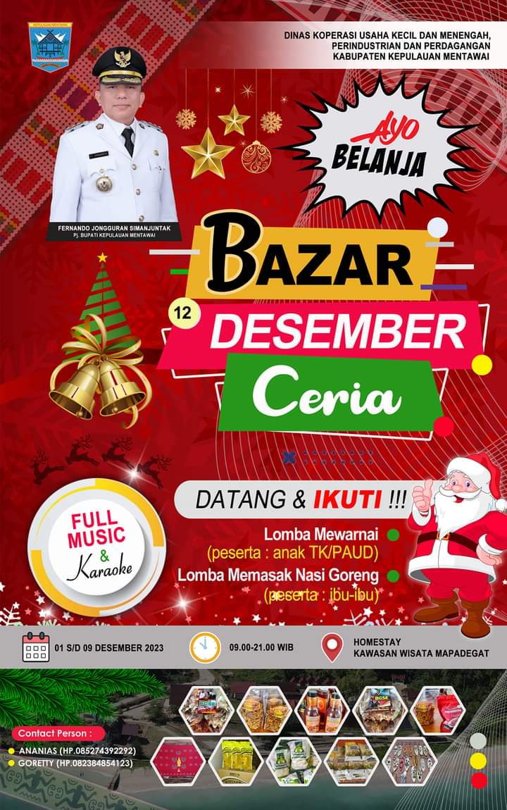 MINANGKABAUNEWS.COM, MENTAWAI – Dengan tema “Desember Ceria” Sambut moment Natal 2023 dan tahun baru 2024, Dinas Koperasi Usaha Kecil dan Menengah Perindustrian dan Perdagangan Kabupaten Kepulauan Mentawai gelar pasar murah atau Bazar natal. Kegiatan pasar murah akan dibuka besok berlangsung selama beberapa hari kedepan dari 2 hingga 9 Desember 2023 di Kawasan wisata Homestay Mapaddegat.