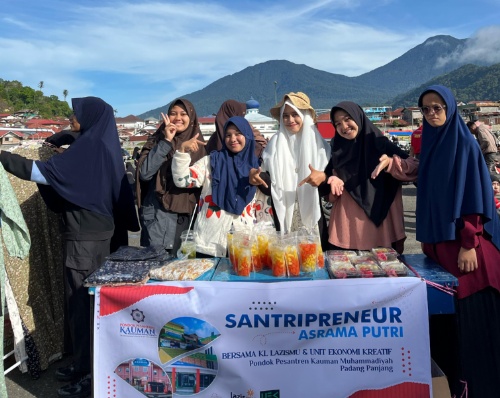 MINANGKABAUNEWS.com, PADANG PANJANG — Ratusan santriwati Pesantren KAUMAN Muhammadiyah Padang Panjang memamerkan semangat kewirausahaan dalam kegiatan “Santripreneur Goes to Bancah Laweh” pada Minggu (20/7). Mereka menawarkan produk andalan seperti rujak buah, es buah, hingga busana syar’i, dalam upaya mengasah keterampilan bisnis dan mendorong kemandirian ekonomi pesantren.