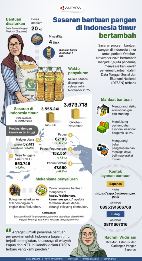 MINANGKABAUNEWS.com, INFOGRAFIK –Penerima program bantuan pangan di Indonesia timur untuk periode Oktober-November 2025 bertambah menjadi 3,6 juta penerima, menyesuaikan jumlah penerima bantuan dalam Data Tunggal Sosial dan Ekonomi Nasional (DTSEN) terbaru.