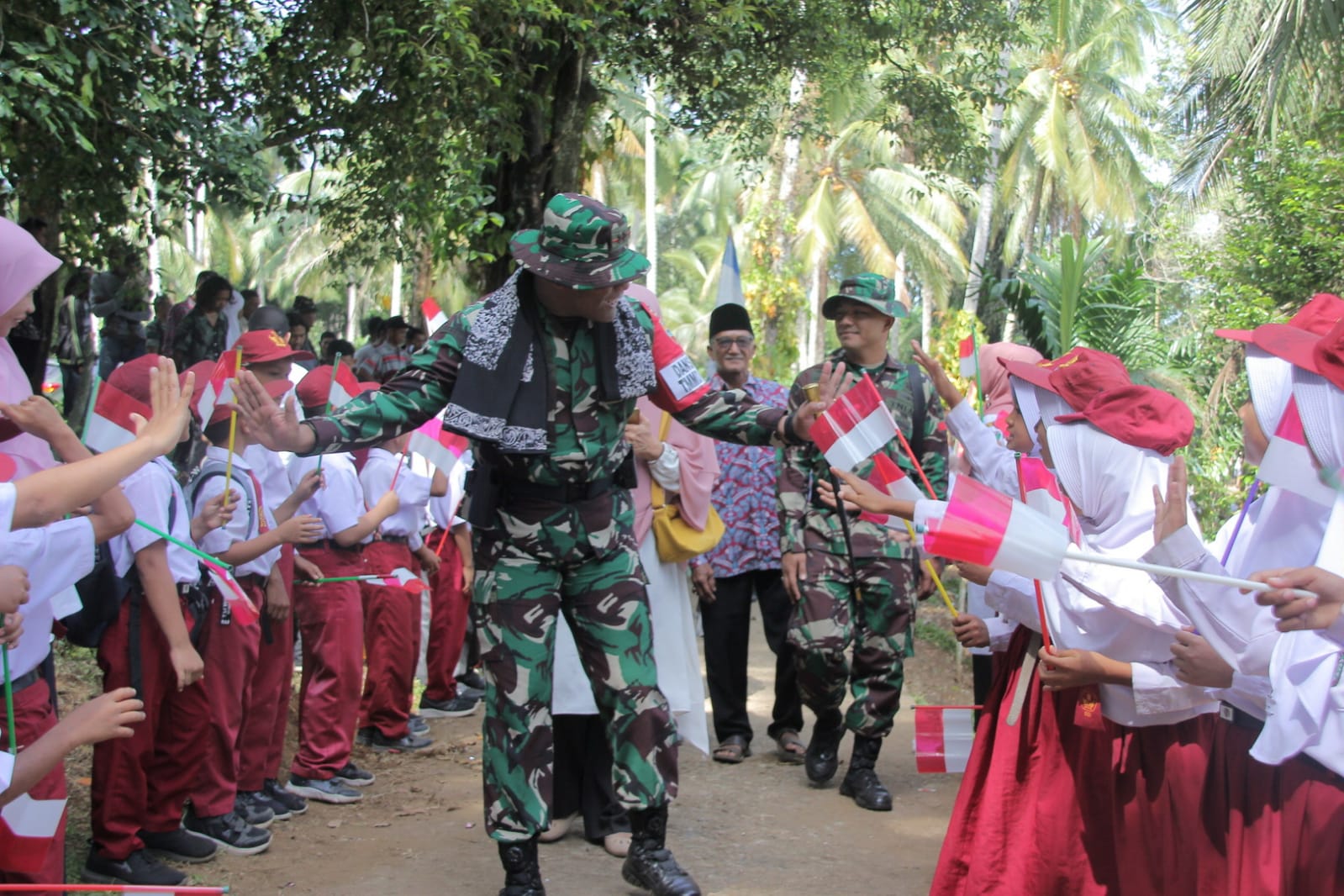 Dengan bendera merah putih ditangan, para siswa tersebut menyambut kedatangan para tamu undangan di sepanjang jalan menuju lokasi pelaksanaan upacara.