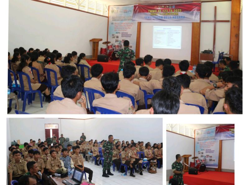 Puluhan siswa siswi SMA nampak antusias mengikuti materi yang diadakan di aula sekolah. Anggota Satgas TMMD ke 123 memberikan Materi tentang Bela Negara dengan pendekatan dan metode.