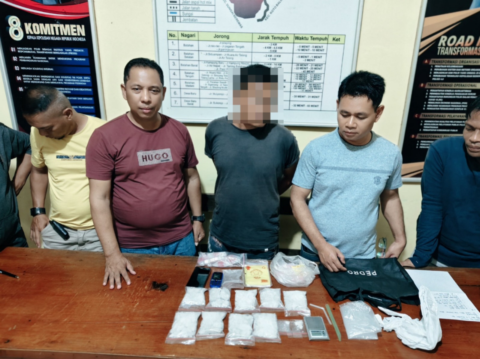 Adapun barang bukti yang berhasil disita dari pelaku RP yaitu 11 paket kecil Narkotika jenis sabu yang dibungkus dengan plastik warna bening yang ditemukan di dalam dompet bertulisan murni, satu buah kaca pirek, satu unit handphone merk Vivo, dua buah dompet dan uang tunai sebesar Rp 500.000,- diduga hasil penjualan sabu-sabu.