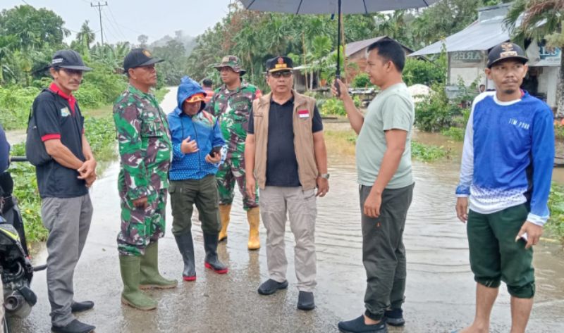 Pengecekan wilayah Banjir di Desa Saureinu dusun Silaoinan yang mengakibatkan banjir dibadan jalan dan rumah warga mencapai ketinggian 70 Cm. Dan mengakibatkan jalan nasional lumpuh tak bisa dilalui oleh kendaraan, ujar Sekda Martinus, Jumat (08/03/2024).