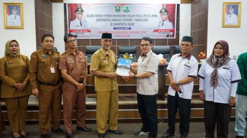 Proses serah terima mahsiswa KKN UNAND periode I Tahun 2025 ini dipimpin Ketua Tim KKN UNAND Periode I Tahun 2025, Prof. Dr. Lucky Zamzami, M.Soc.Sc, dan diterima oleh Bupati Solok diwakili Staf Ahli Bidang Ekbang, Eva Nasri, SH, MH.