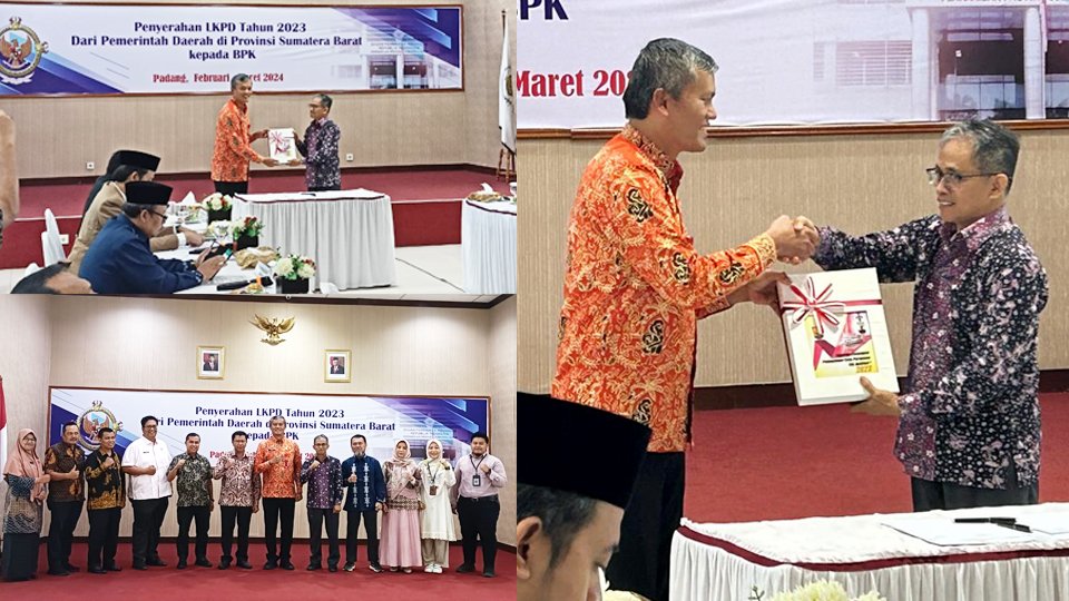 MINANGKABAUNEWS, PARIAMAN — Pj Walikota Pariaman Roberia serahkan LKPD (Laporan Keuangan Pemerintah Daerah) Kota Pariaman tahun 2023 un Audited, kepada Kepala BPK Perwakilan Sumatera Barat, Arif Agus di Ruang Rapat Lantai III Gedung BPK RI Perwakilan Sumbar, Jalan Khatib Sulaiman, Kota Padang, Kamis (7/3/2024).