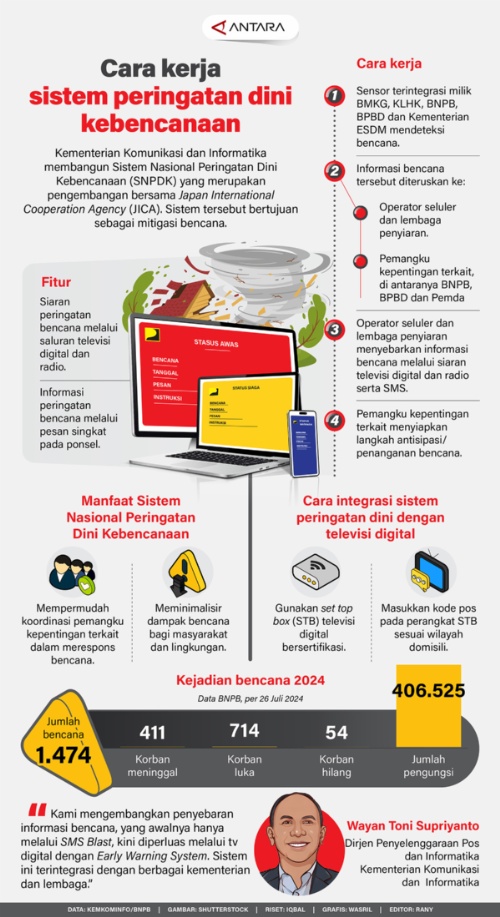 MINANGKABAUNEWS.com, INFOGRAFIS — Kementerian Komunikasi dan Informatika membangun Sistem Nasional Peringatan Dini Kebencanaan (SNPDK) yang merupakan pengembangan bersama Japan International Cooperation Agency (JICA). Sistem tersebut bertujuan sebagai mitigasi bencana. (ANTARA)