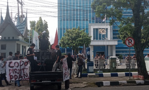 MINANGKABAUNEWS.com, PADANG – Senin siang, udara di Jalan H. Agus Salim mendidih lebih cepat dari biasanya. Terik matahari tak seberapa dibanding panasnya amarah puluhan massa yang mengepung kantor Perusahaan Daerah Air Minum (PDAM) Kota Padang. Spanduk terbentang, suara toa menggelegar, dan kalimat sindiran tajam berulang kali dilontarkan.