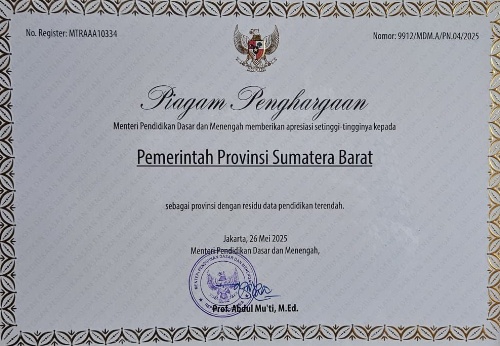 Dengan penghargaan ini, Sumatera Barat memperkuat posisinya sebagai provinsi dengan tata kelola pendidikan yang efisien dan berbasis data.