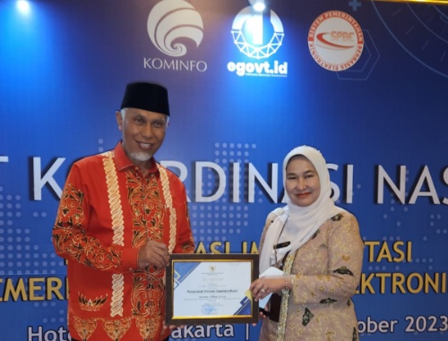 MINANGKABAUNEWS.com, PADANG –Gubernur Sumatera Barat Mahyeldi menerima dua penghargaan dari Kementerian Kominfo RI. Penghargaan tersebut diberikan atas andil Pemprov Sumbar mewujudkan pemerintahan berbasis elektronik melalui pemanfaatan layanan jaringan intra pemerintah dan pemanfaatan layanan mail multidomain.